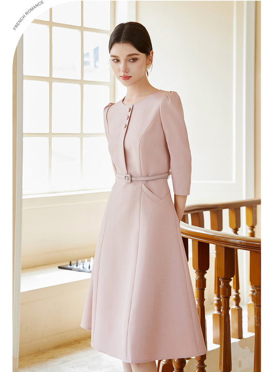 Temperament mid-sleeve pink dress (with belt)
