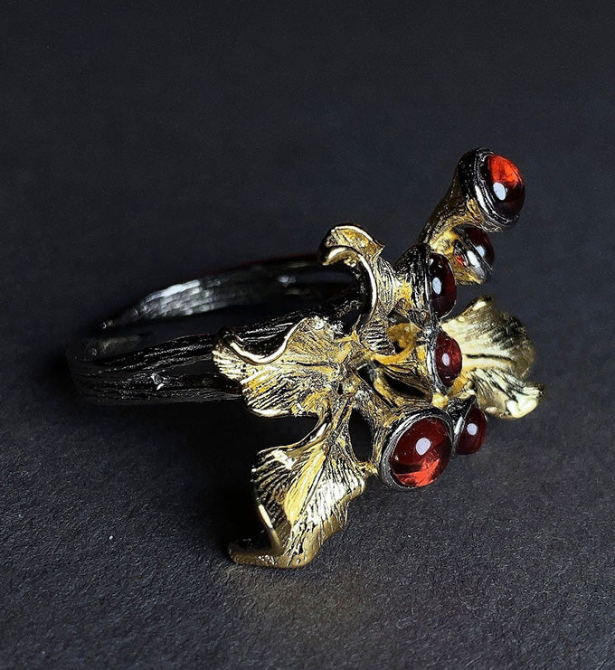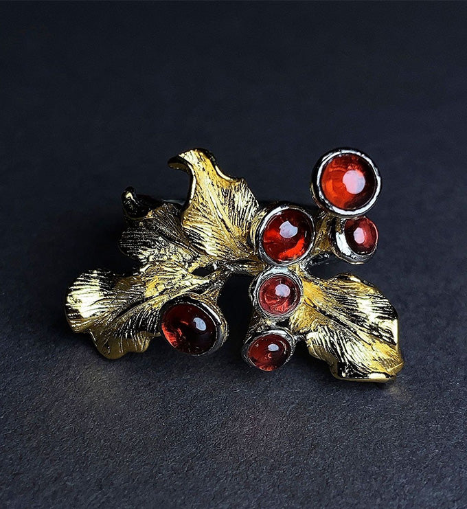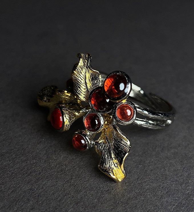 Plant flower ring-Natural Red Garnet, S925 sterling silver, gold-plated.