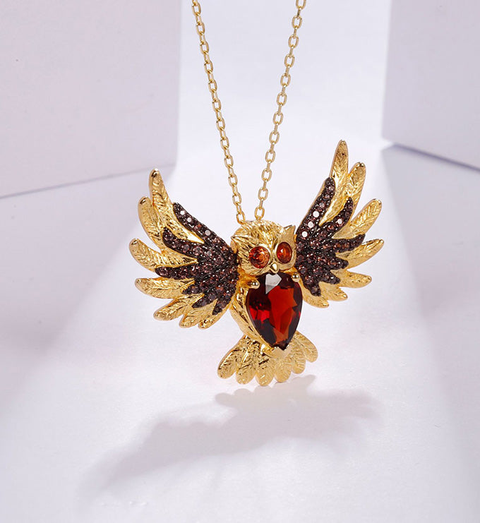 Owl brooch-Natural Red Garnet-Smoky Quartz- Green Agate