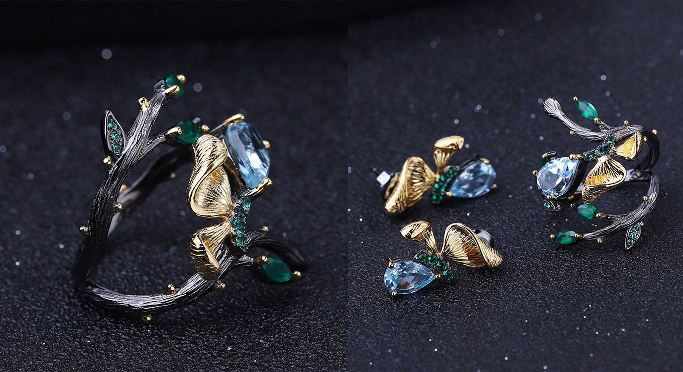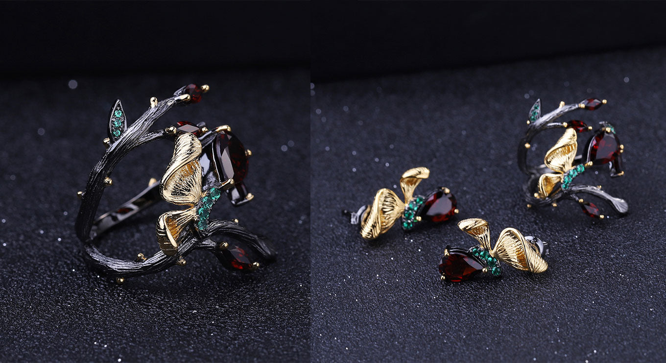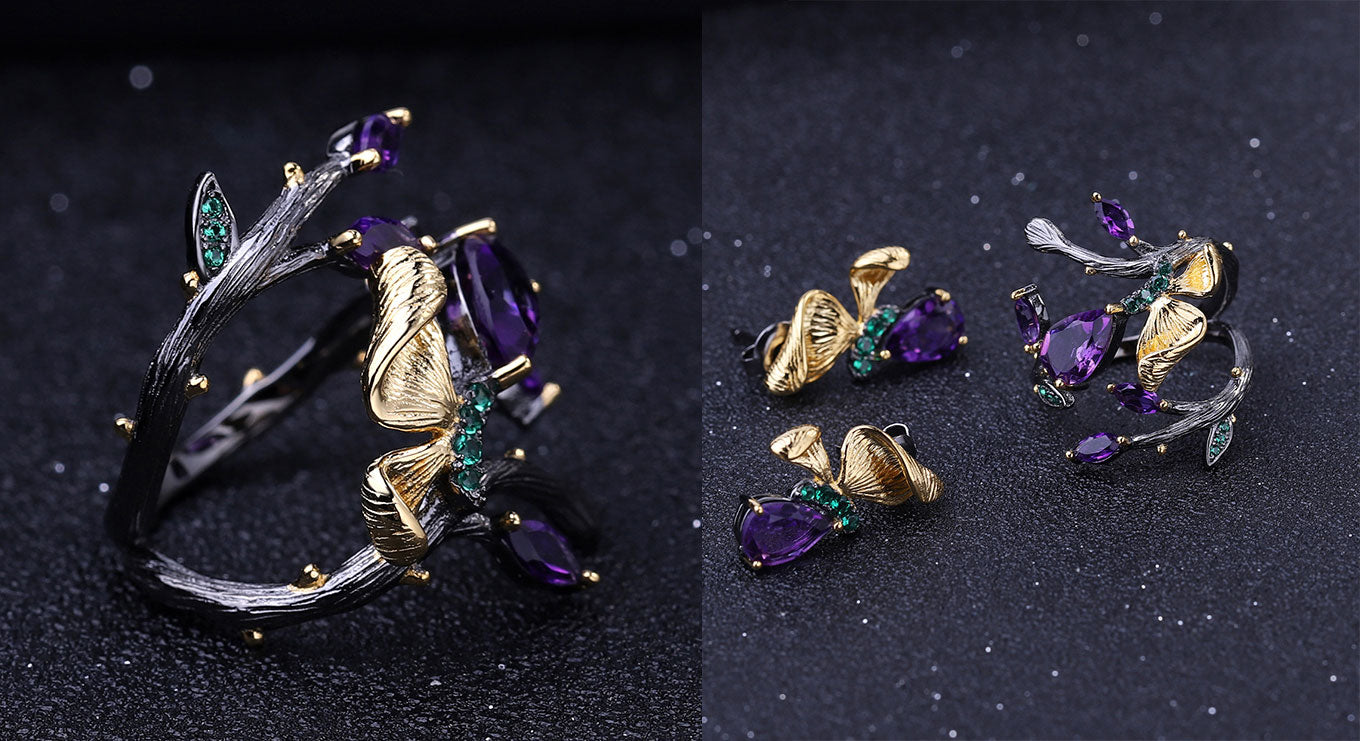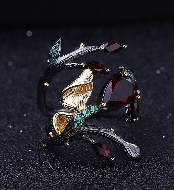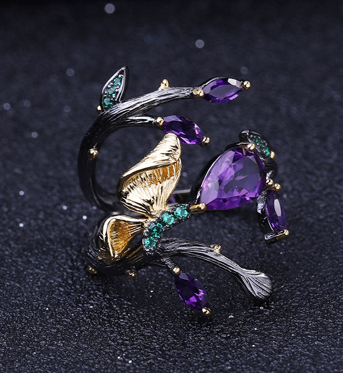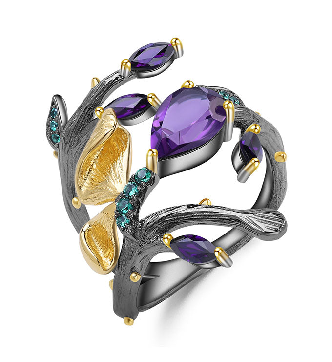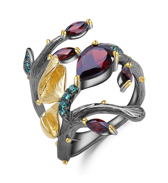 Pastoral ring, handmade high-grade jewelry, main stone: Natural red garnet, blue topaz, amethyst; Metal: 925 sterling silver, plated with 18K gold and rhodium.