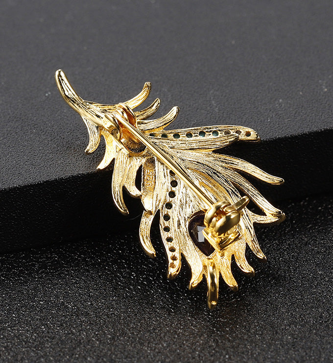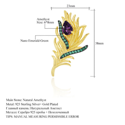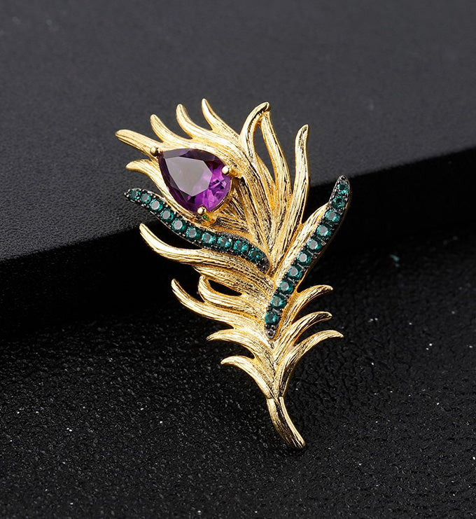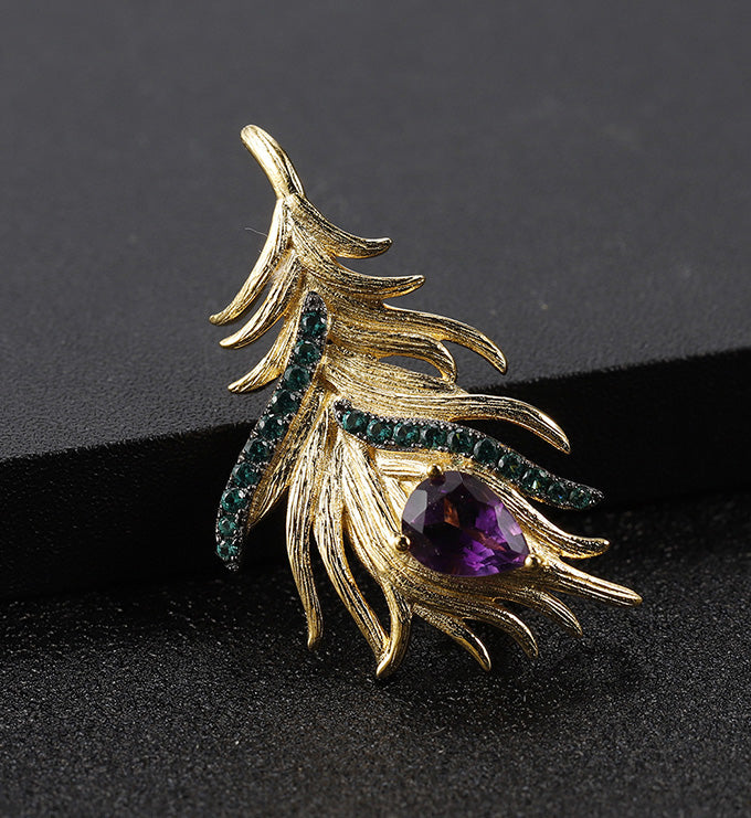 Peacock Feather brooch, Natural Gem Pendant ,Amethyst high-grade jewelry, handmade, S925 sterling silver, 18k gold-plated.