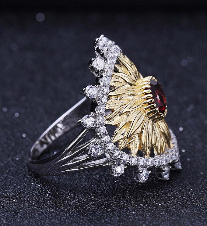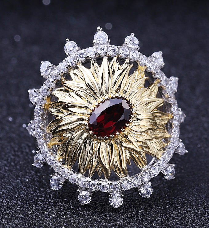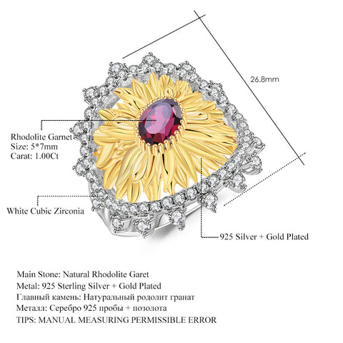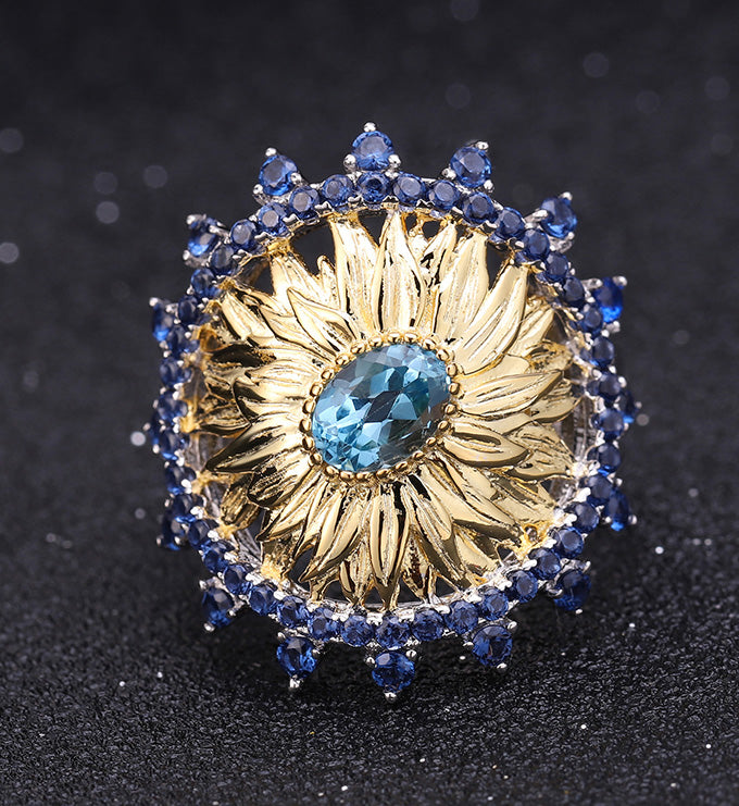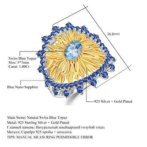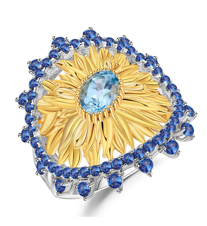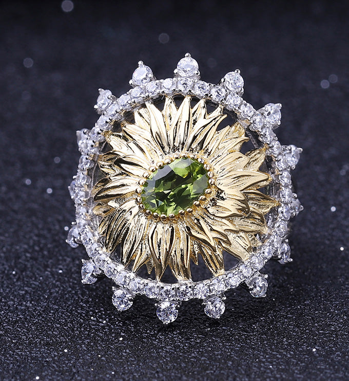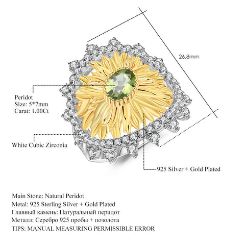 Sunflower Ring-Natural Peridot-Garnet-Blue Topaz, S925 Sterling silver, 18K gold-plated.