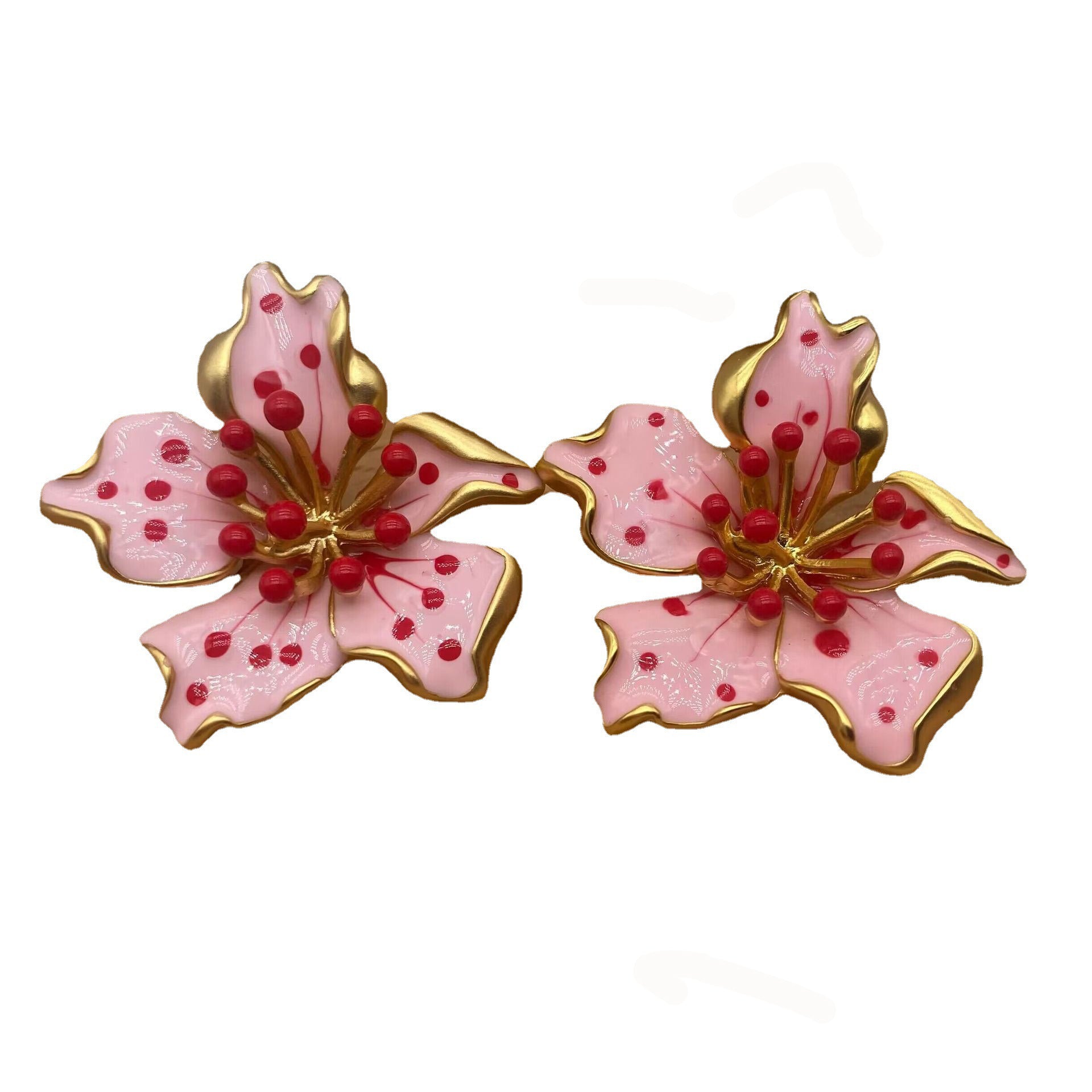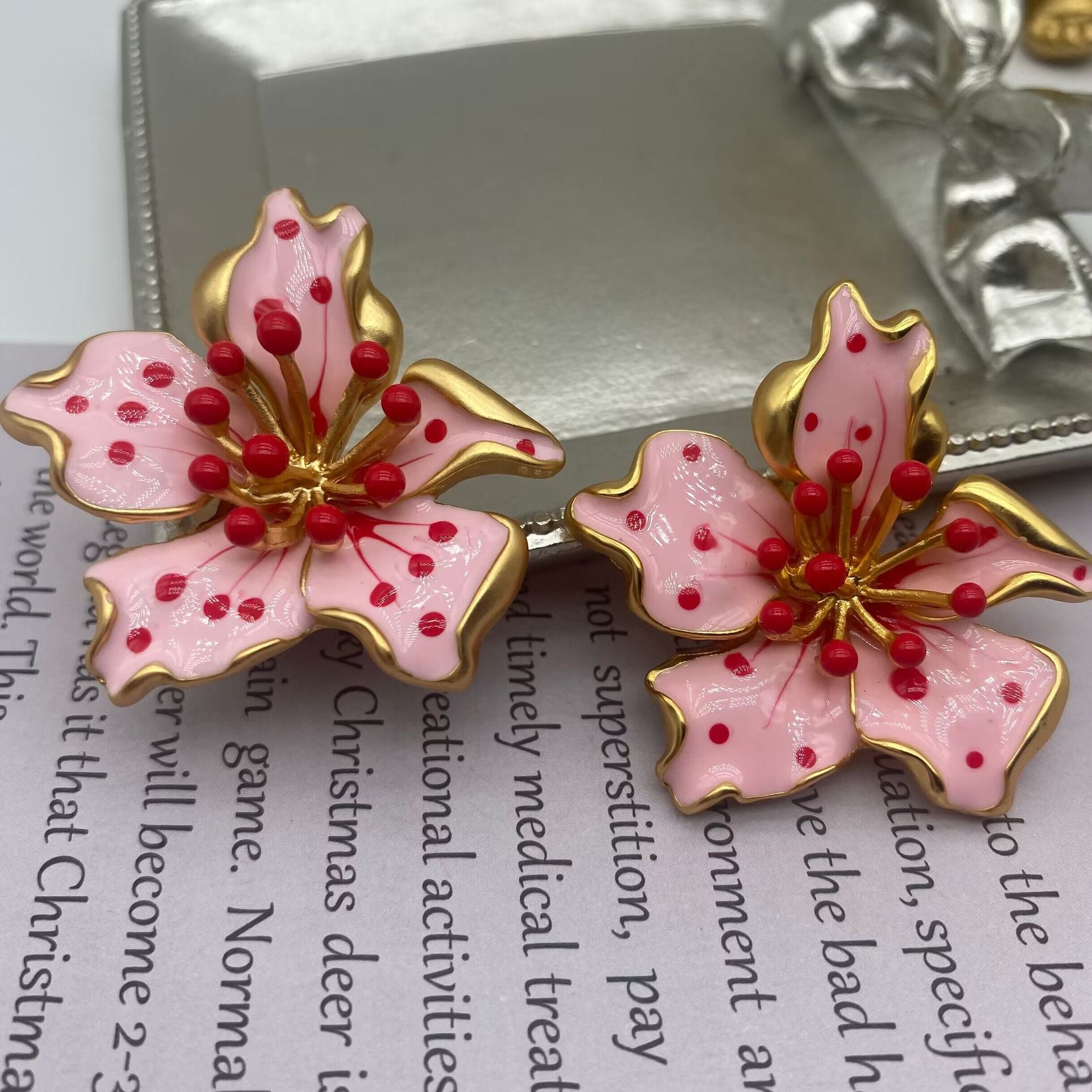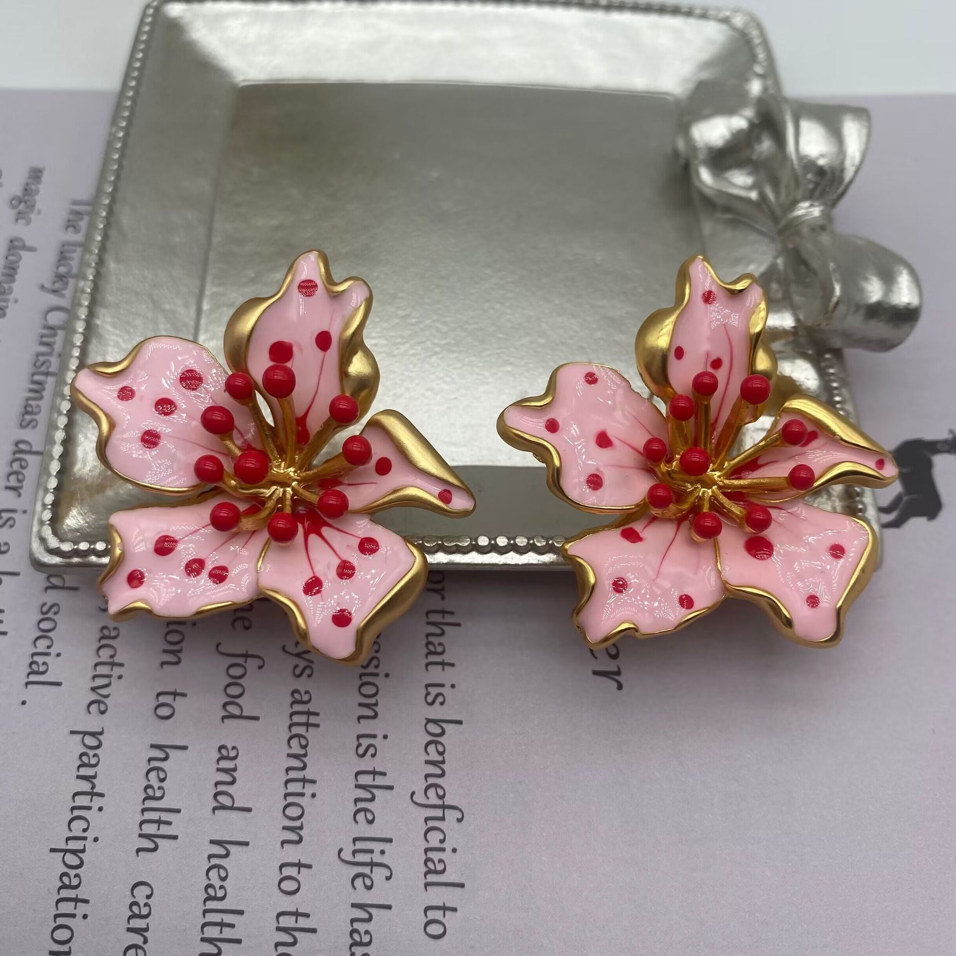 Flower brushed enamel colored earrings, alloy plated with genuine gold, sterling silver pins.There are two options available: earring pins and earring clips