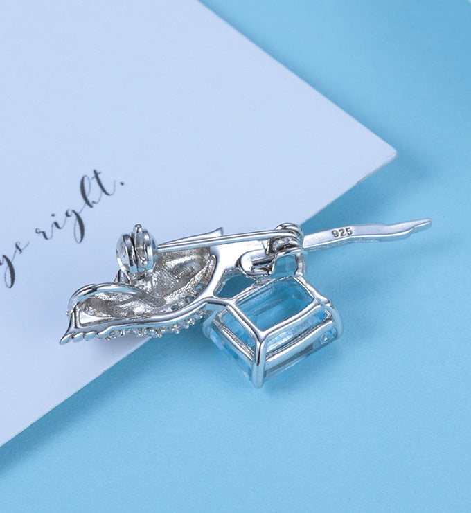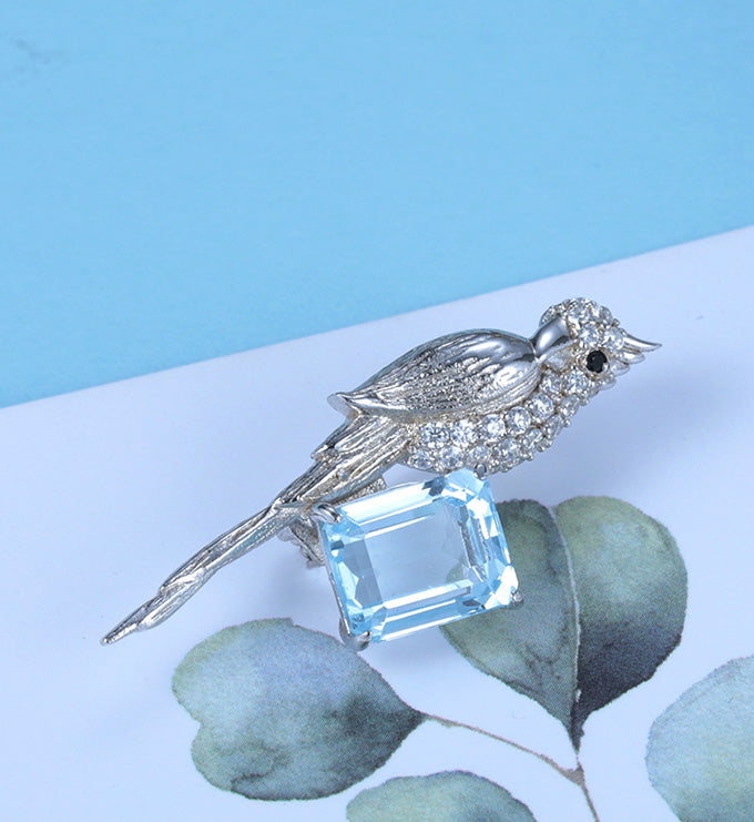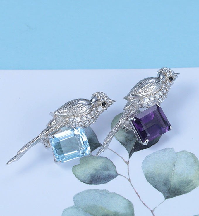 Birdie brooch Natural gems jewelry, Amethyst and Topaz, S925 sterling silver, handmade