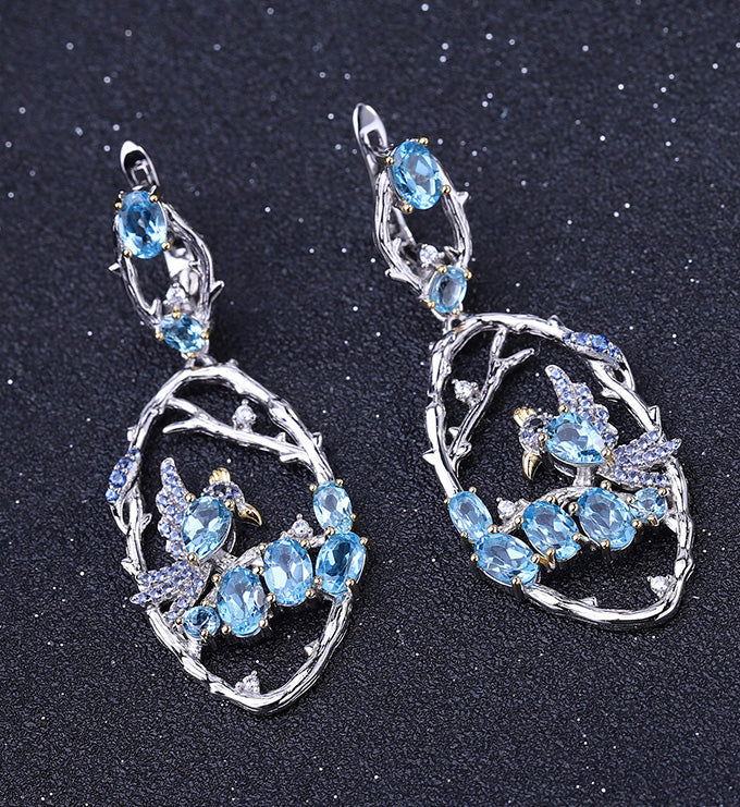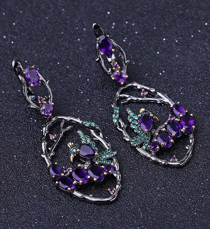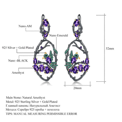 Bird earring-Natural Amethyst-Blue Topaz, S925 sterling silver, 18k gold-plated.