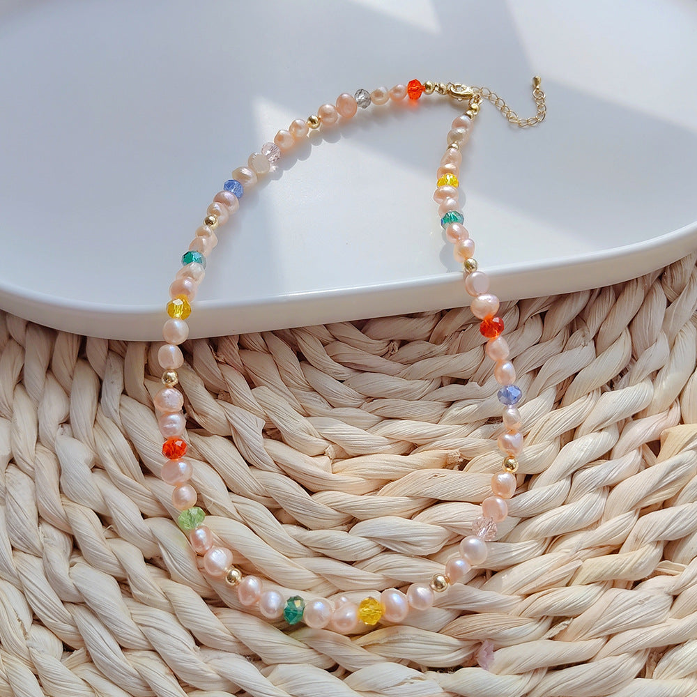 Pink Natural Pearl Necklace Women's Handmade Beaded Colorful Crystal Collar Chain