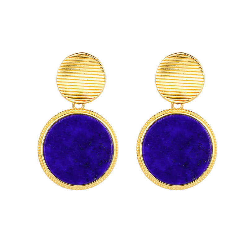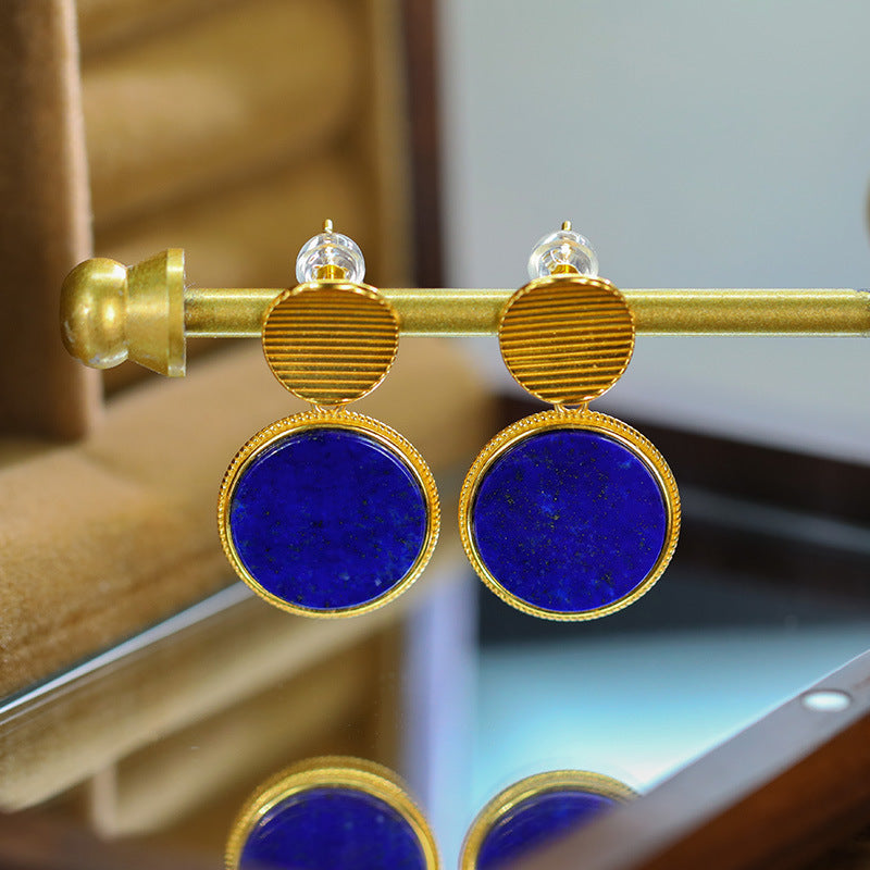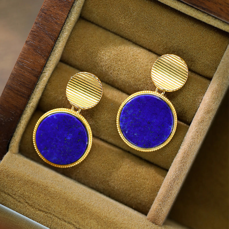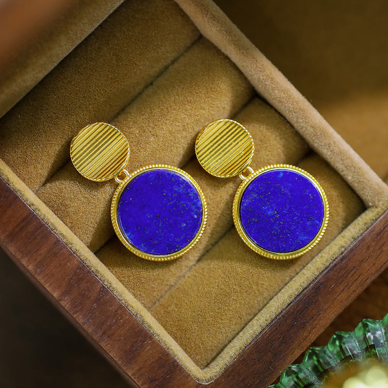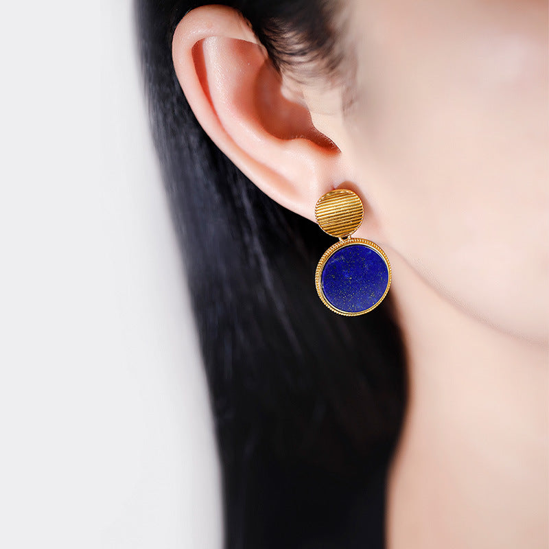 Sterling Silver Plated Gold Inlaid Natural Lapis lazuli Round Women's Earrings