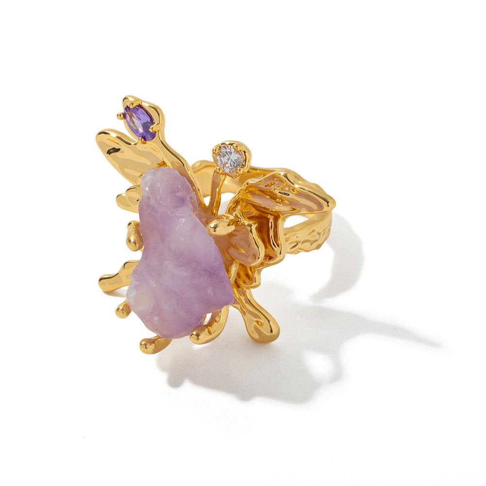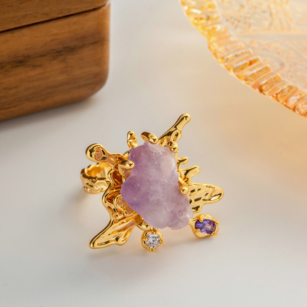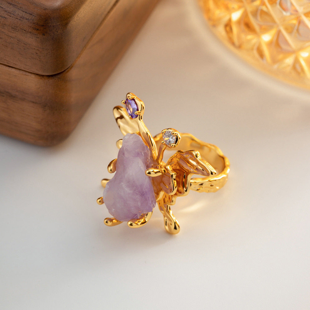 Chinese Natural amethyst Gem Ring Women's Copper Plated 18K Gold Jewelry